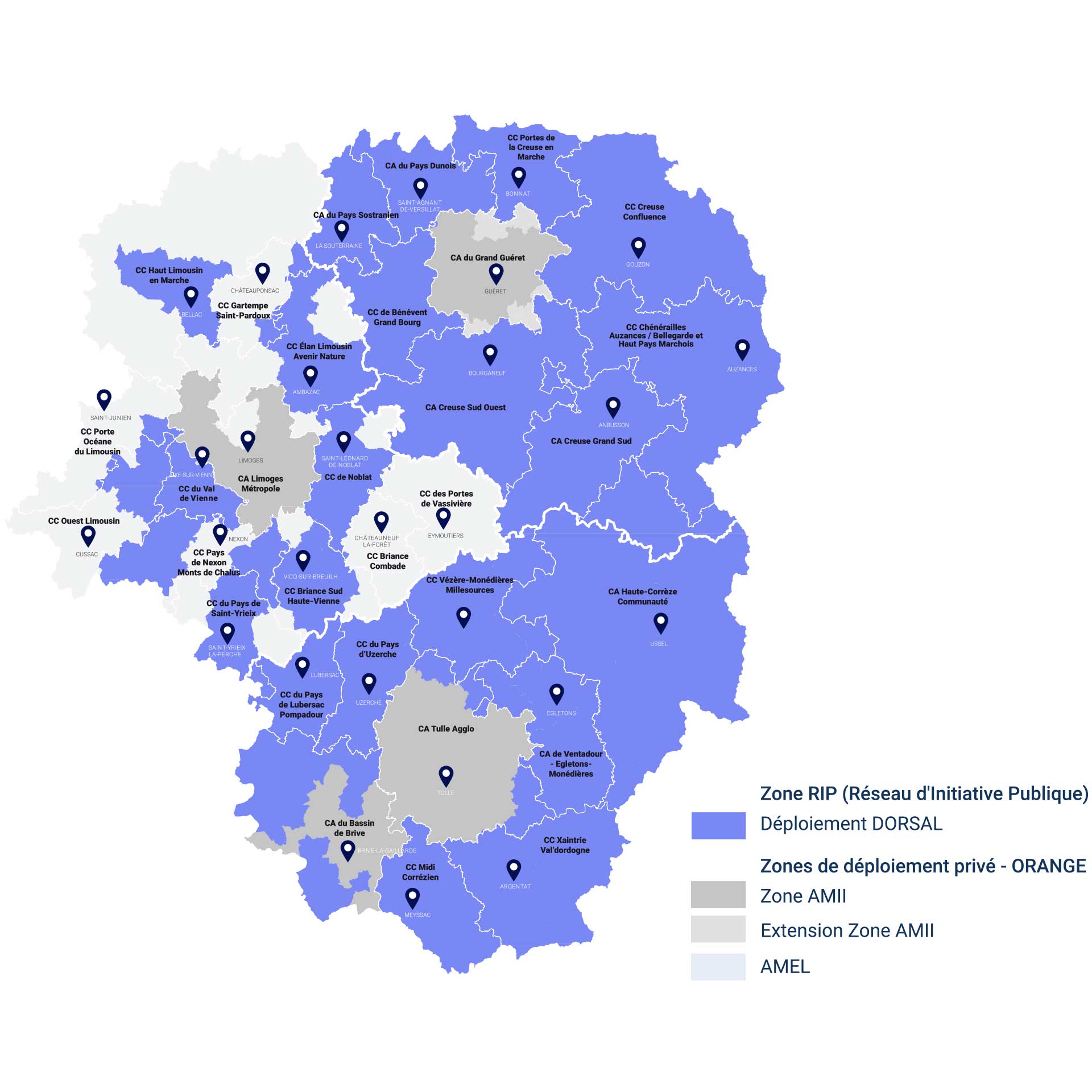 Dans les zones AMII* et AMEL* ce déploiement est assuré par Orange.* Appels lancés par l’État dans le cadre du programme national très haut débit :