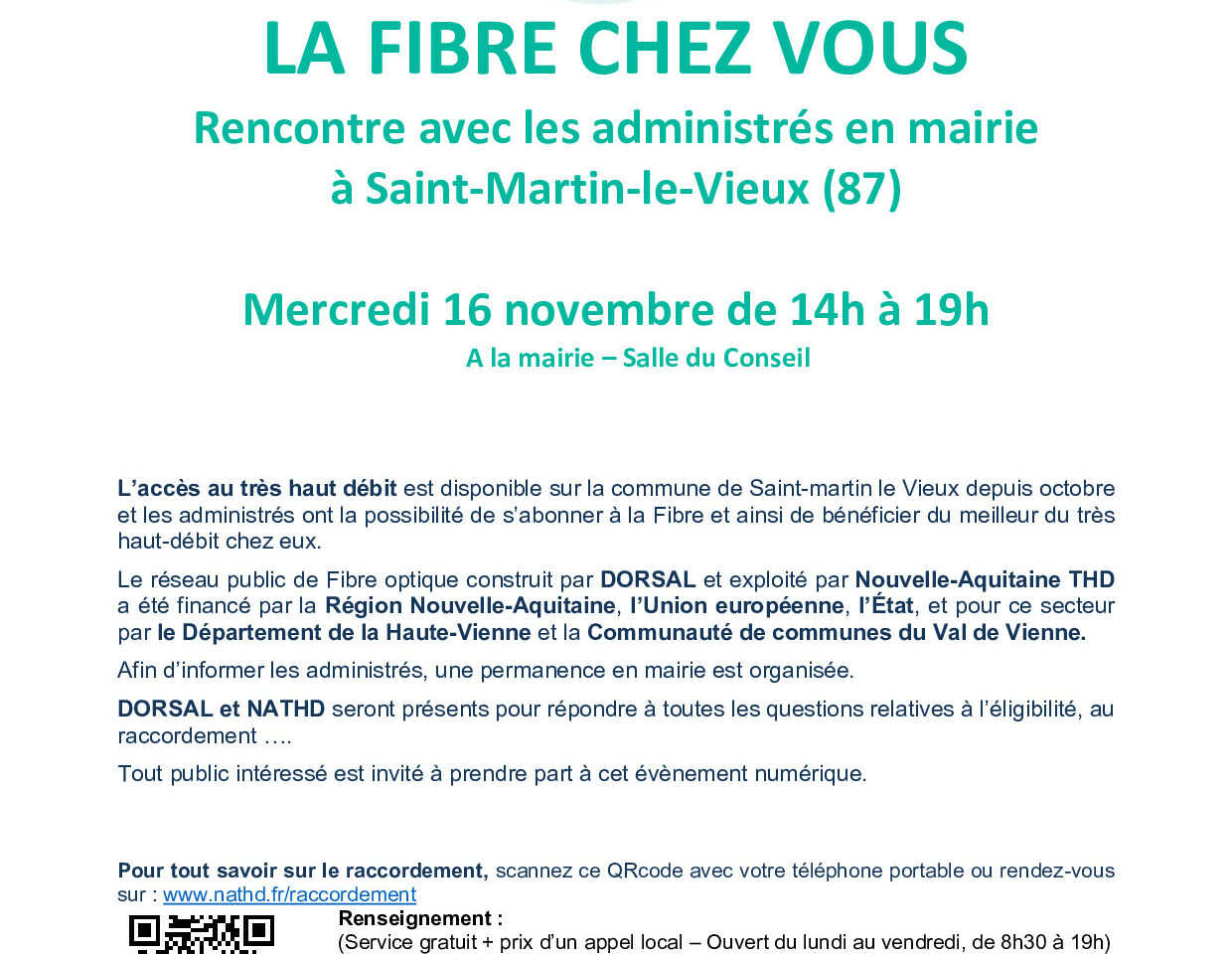 L’accès au Très haut débit est disponible à Saint-Martin-le-Vieux depuis octobre et les administrés ont la possibilité de s’abonner à la Fibre et ainsi de bénéficier du meilleur du Très haut-débit chez eux.