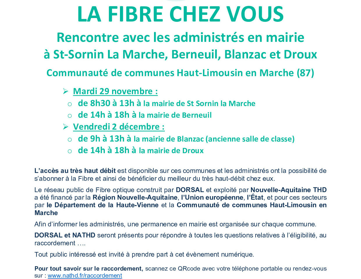 Le réseau public de Fibre optique construit par DORSAL et exploité par Nouvelle-Aquitaine THD a été financé par la Région Nouvelle-Aquitaine, l’Union européenne, l’État, et pour ce secteur le Département de la Haute-Vienne et la Communauté de communes Haut Limousin en Marche.