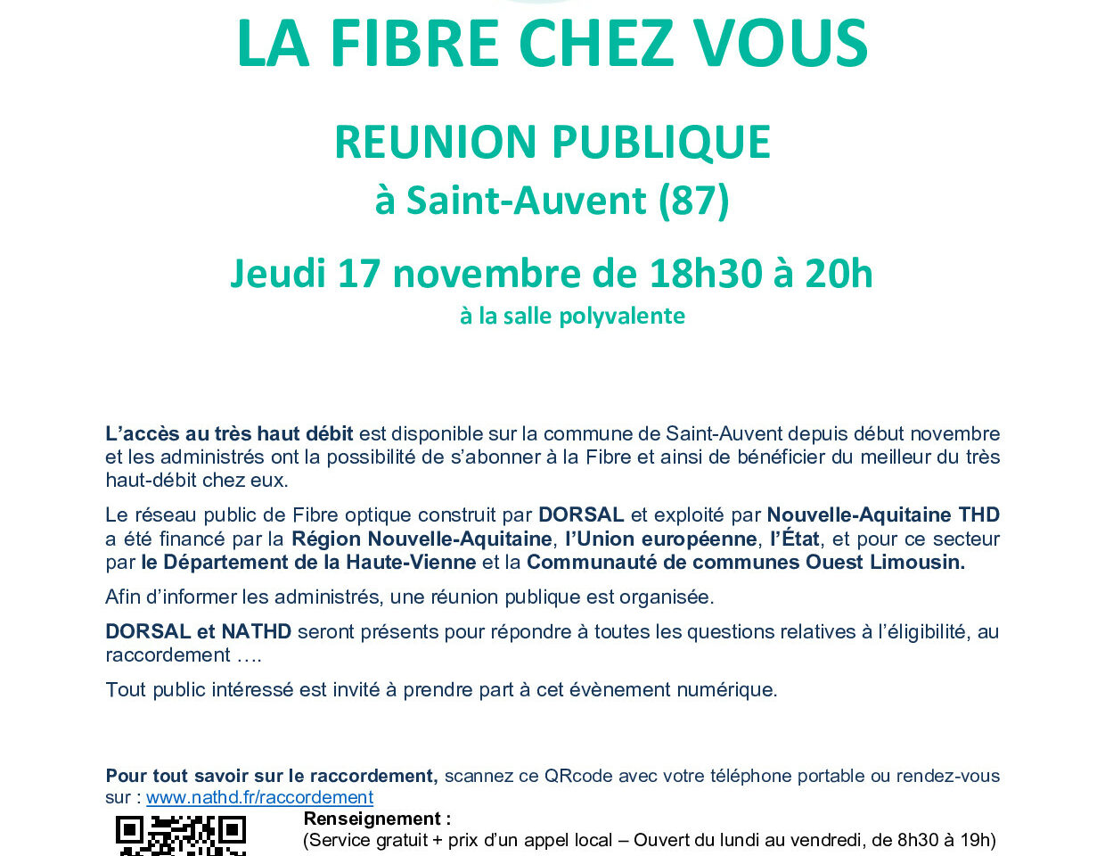 L’accès au Très haut débit est disponible à Saint-Auvent depuis début novembre et les administrés ont la possibilité de s’abonner à la Fibre et ainsi de bénéficier du meilleur du Très haut-débit chez eux.